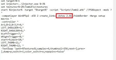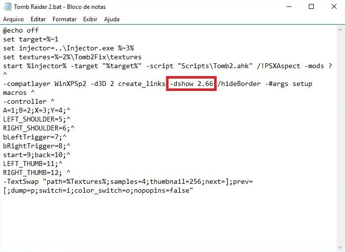 - Para as FMV’s funcionarem em tela cheia, abra o Help.exe novamente e na aba do TR2 desça até a seção Substituindo as FMVs. Clique em replacing e no arquivo que abrir, procure por -dshow 1.0 e mude o valor para 2.66 (para resoluções 1920 X 1080). Salve o arquivo. Para resoluções menores, vá diminuindo esse valor e salvando o arquivo até elas funcionarem.