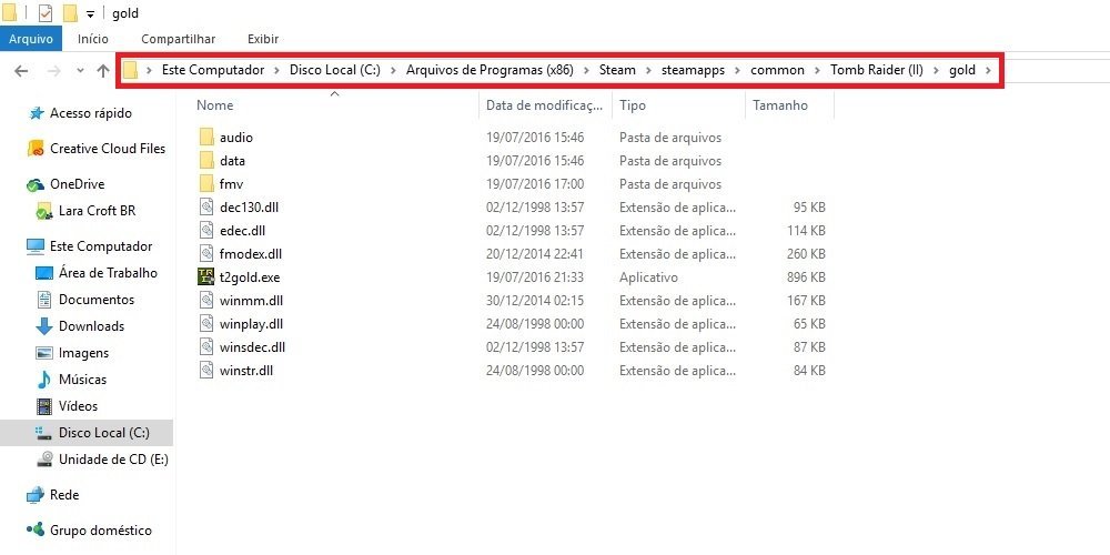 - No desktop contém agora uma pasta para cada jogo. Abra-as e copie os arquivos de dentro de cada uma delas para as respectivas pastas onde os jogos estão instalados e substitua-os quando for solicitado. No caso da versão Steam, elas ficam em: C:\Arquivos de Programas (x86)\Steam\steamapps\common. Porém, NÃO COPIE os arquivos do TR4 e TR5. Substitua apenas os do TR2, 3 e Lost Artifact.