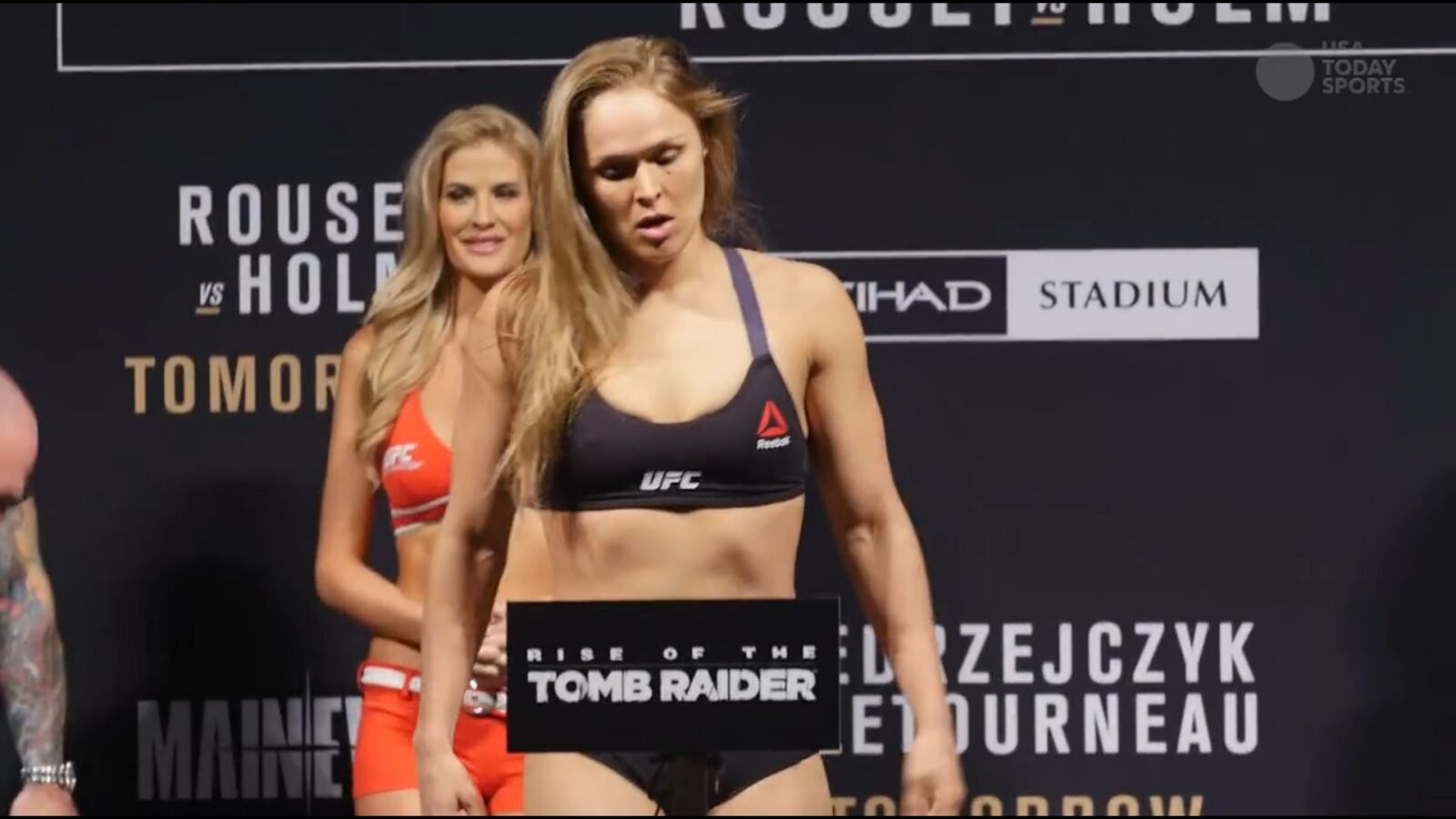 O logotipo de Rise of the Tomb Raider ganha destaque também ao ser visto na placa onde é feita a pesagem dos lutadores (onde geralmente é escrito “UFC”), onde ocorreu a pesagem de Holly Holm, Ronda Rousey, entre outros desafiantes. Além da exibição nas lutas principais, era também possível ver o logotipo ao canto direito da tela em transmissões oficiais, e nas lutas do UFC Free Fights ocorridas também no Staples Center em Los Angeles (Califórnia), nos Estados Unidos.