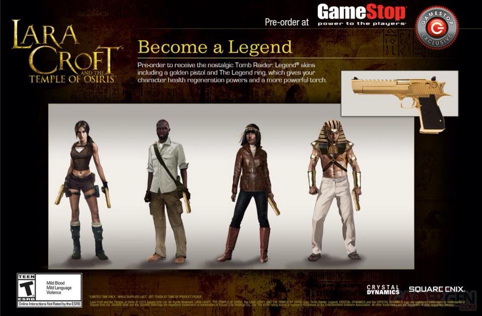 Torne-se uma Lenda com Lara Croft Legend Pack, disponível apenas no GameStop. Compre antecipadamente e receba a nostálgica roupa de Tomb Raider Legend (Underworld), incluindo a pistola dourada, que trará ao seu personagem poderes de regeneração e uma tocha mais poderosa.