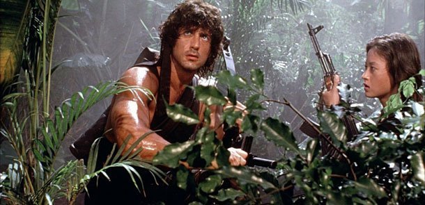 A Crystal Dynamics não vê Lara Croft tendo muito em comum com o John Rambo de Sylvester Stallone, mas o filme tem alguns bons exemplos de guerrilha furtiva, algo que Lara usa contra seus inimigos.